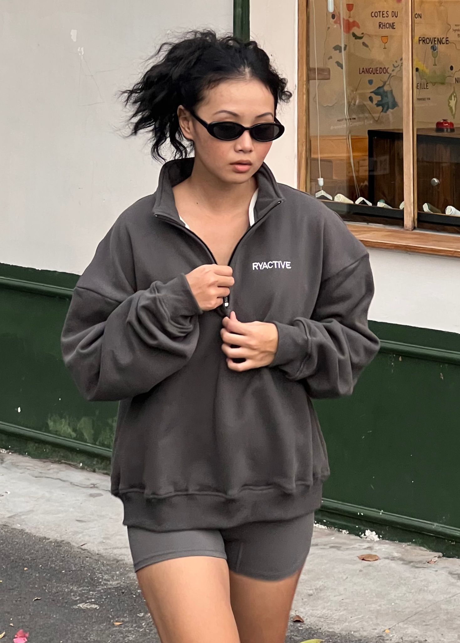- Chi tiết khóa kéo cách điệu dọc theo phần cổ áo, tạo thành áo cổ lọ