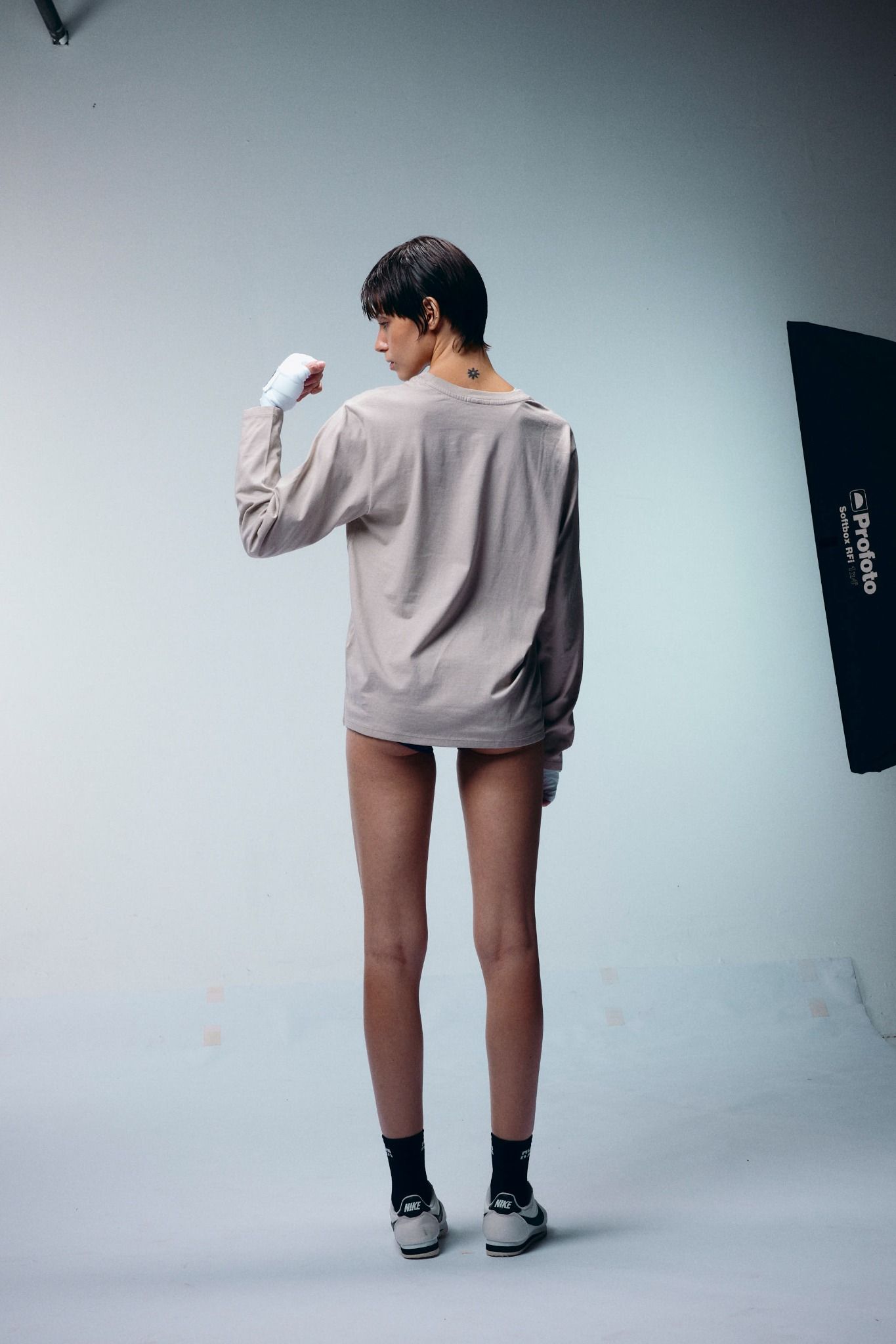 - Áo tay dài, không bo gấu tay áo, cổ tròn